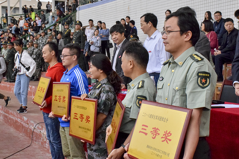 10月13日上午8点半,我校于第一田径场举办了2018级学生军训检阅暨总结表彰大会。我校党委书记刘德顺,校长李伯超,党委副书记朱曲川,湘潭市军分区战备处处长向富生,副校长周飞跃、胡石其、刘友金、廖湘岳以及各学院负责人出席本次活动。我院党委副书记周筱芬和18级辅导员魏庆龄与会。