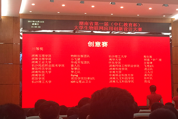 10月15日下午,“中仁教育杯”湖南第一届大学生物联网应用创新设计大赛暨第一届物联网应用创新设计大赛颁奖仪式于中南大学举行,我校两支创新团队获奖。
