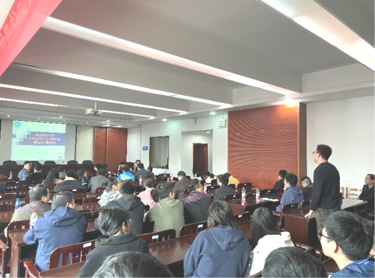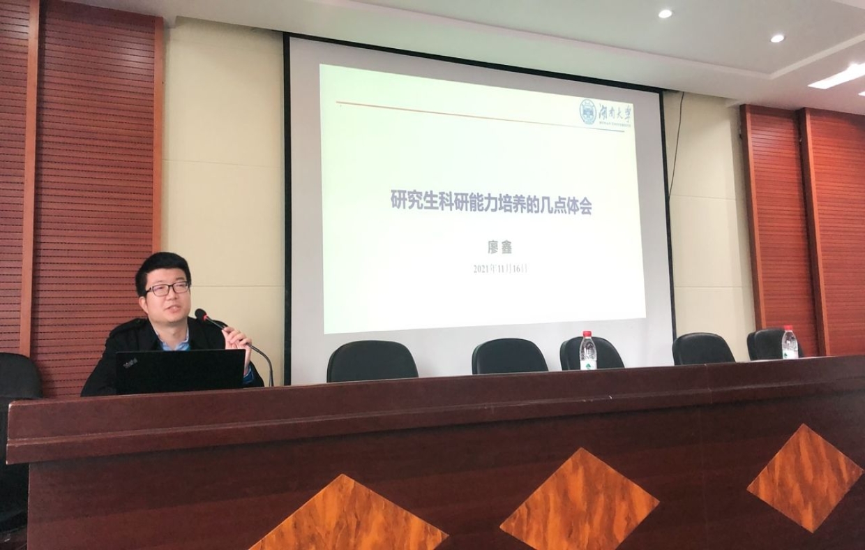 随后,湖南大学胡玉鹏教授、荣辉贵副教授和廖鑫副教授分别就研究生培养进行了精彩讲座。胡玉鹏教授以“研究生的科研视野与素养训练体会”为主题,引用王国维《人间词话》中的人生三种境界,提出做学问相应也有三个对应的层次。